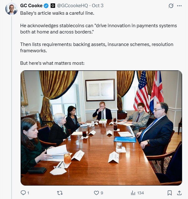 GC Cooke, a co-founder of UK-based stablecoin management platform Brava Finance, said that BoE governor Andrew Bailey is warming to the idea of stablecoins existing alongside central bank-controlled assets like central bank digital currencies.