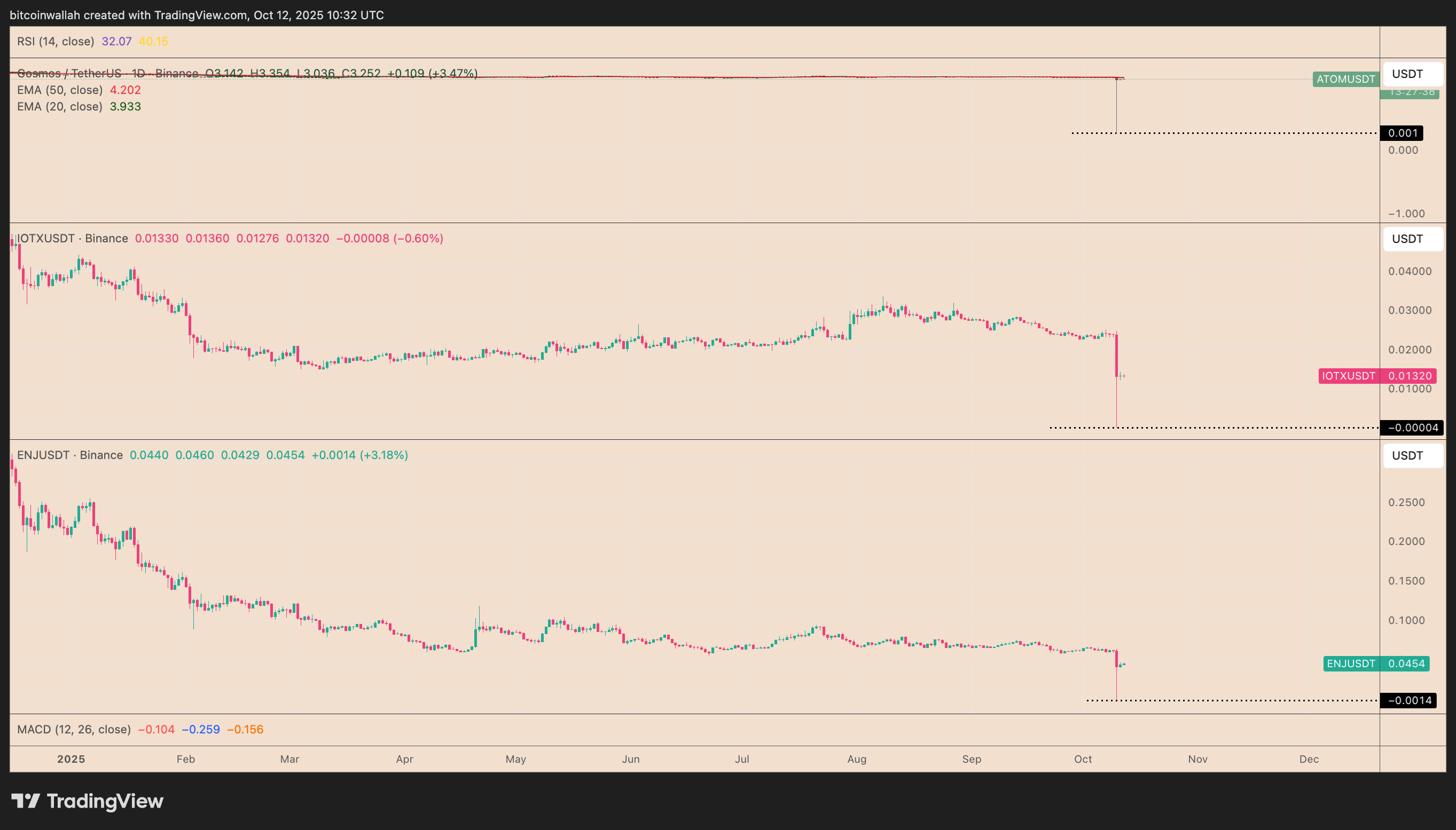 That includes tokens like Cosmos (ATOM), IoTeX (IOTX), and Enjin (ENJ), whose prices on Binance briefly hit zero.