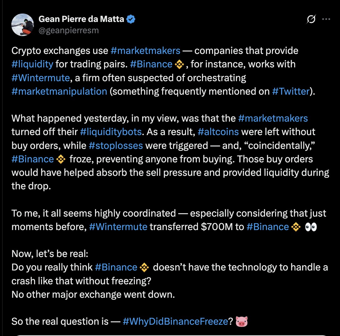 As prices plunged, Binance’s trading systems became overloaded. Some users reported frozen accounts, missed stop-losses, and delayed trades.