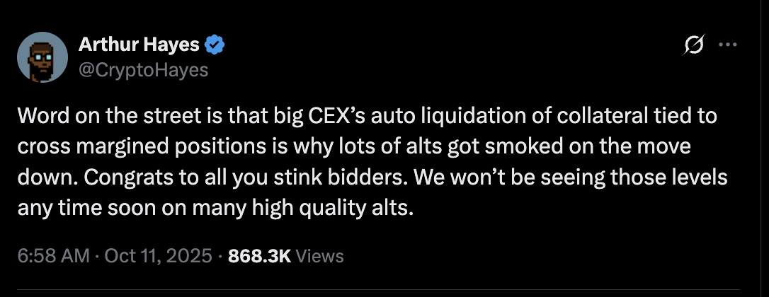 BitMEX co-founder Arthur Hayes said that major exchanges, including Binance, were “liquidating collateral tied to cross-margin positions,” which exacerbated the sell-off.