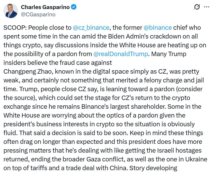“Trump… is leaning toward a pardon (consider the source), which could set the stage for CZ’s return to the crypto exchange since he remains Binance’s largest shareholder,” he said, citing people close to Zhao.