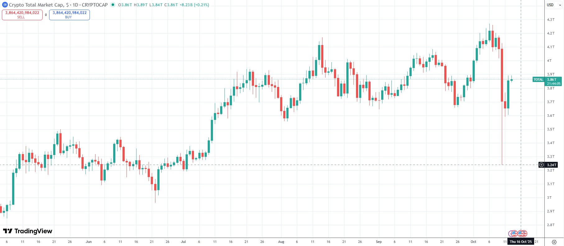 Crypto’s largest leverage liquidation event resulted in a trillion-dollar market cap wick down. Source: TradingView
