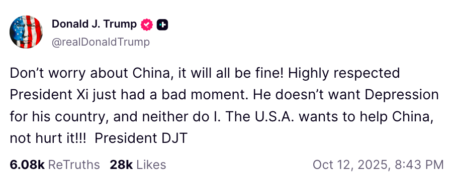 “Don’t worry about China, it will all be fine!” he wrote on Sunday.