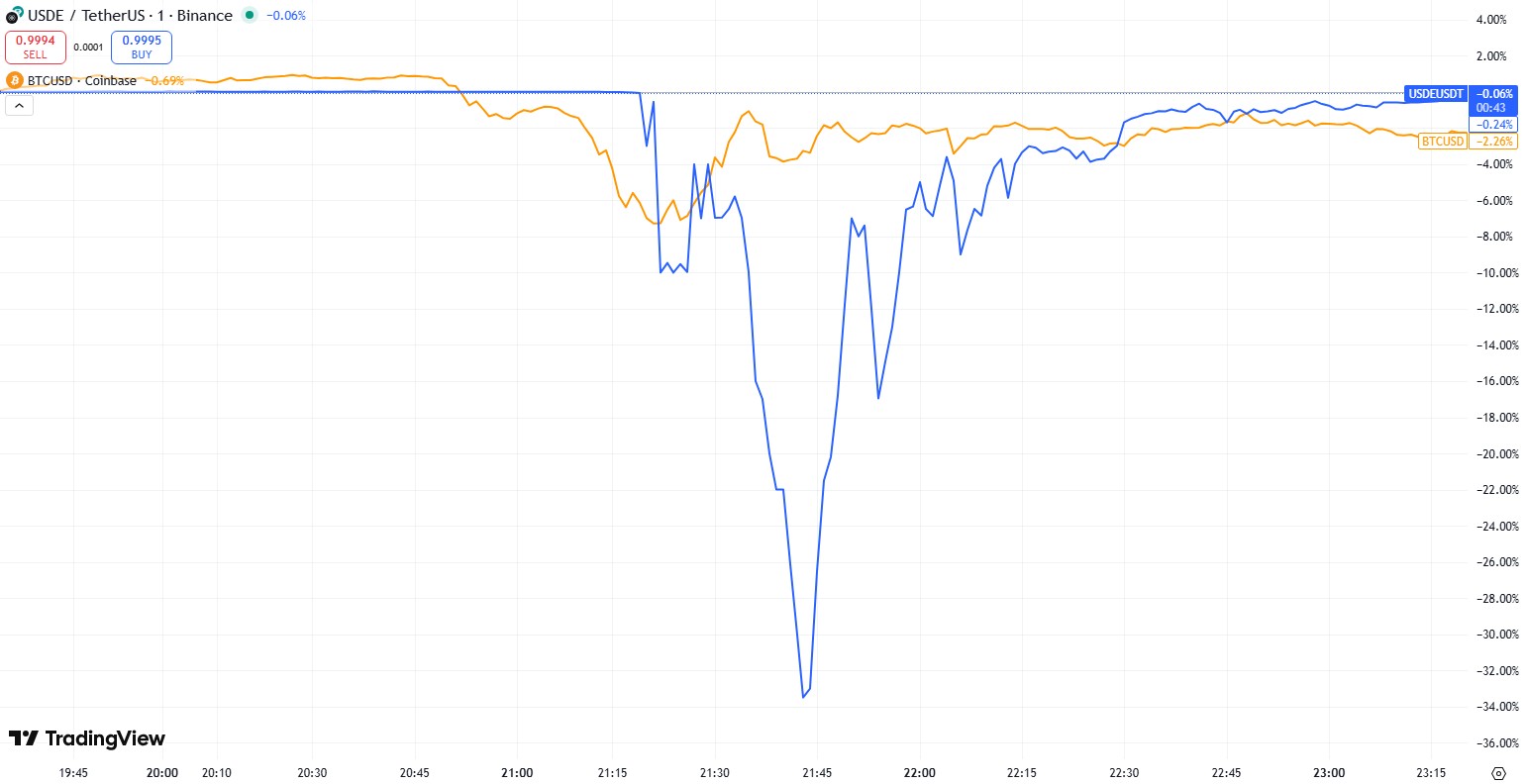 Bitcoin’s price drop on Coinbase came before the USDe dislocation on Binance. Source: TradingView