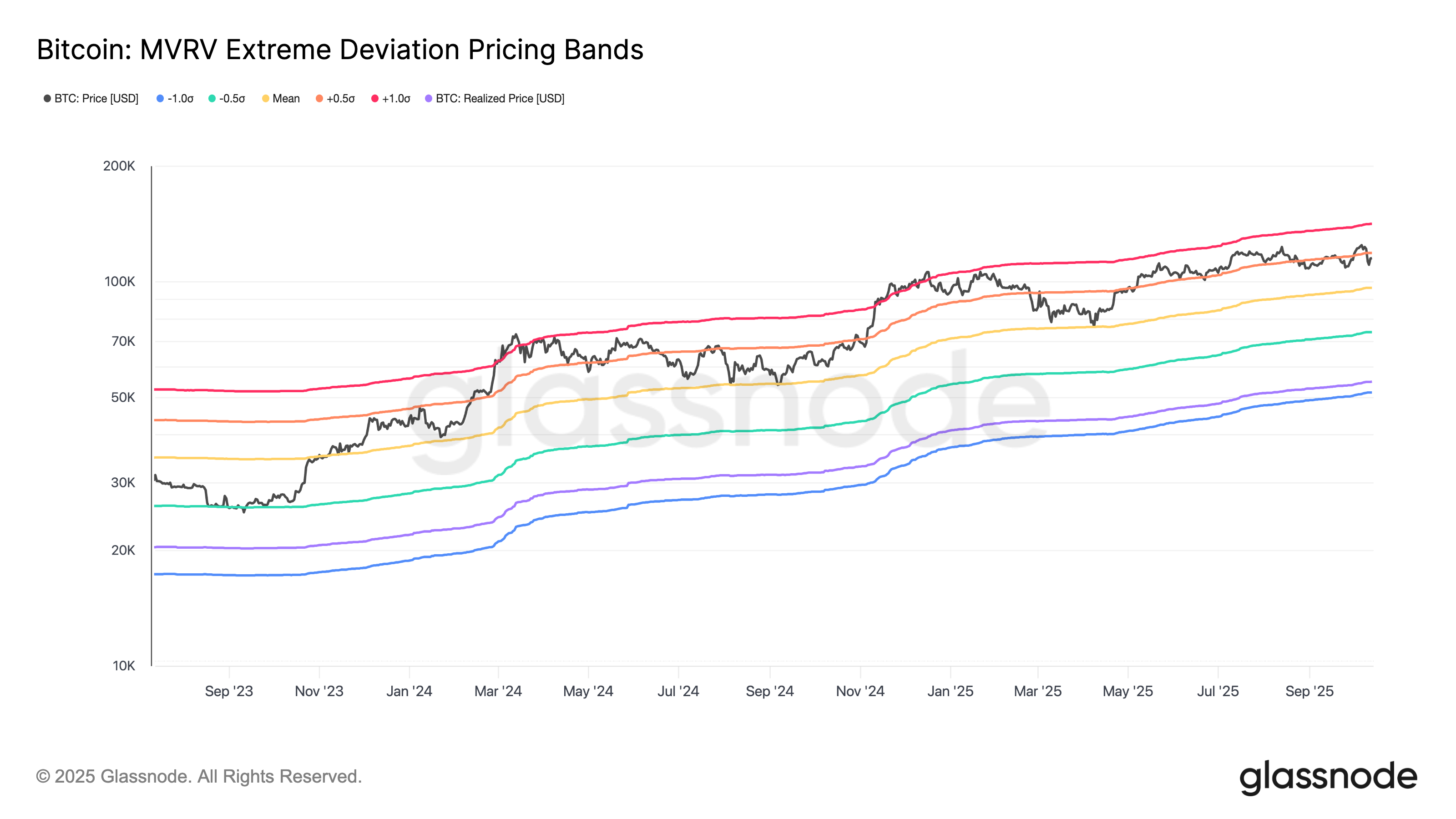 Bitcoin is now trading below its +0.5 standard deviation band (+0.5σ band; orange) near $119,000, according to Glassnode’s MVRV Extreme Deviation Pricing Bands.