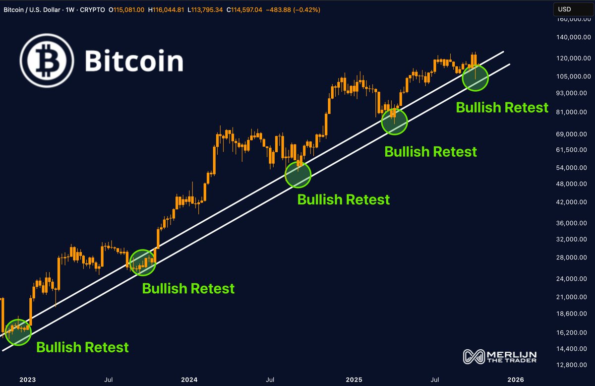 On a higher time frame, crypto trader Merlijn observed that Bitcoin is currently retesting the multi-year uptrend that has remained intact since 2022. Historically, this trendline has served as a springboard during each correction of the current cycle.