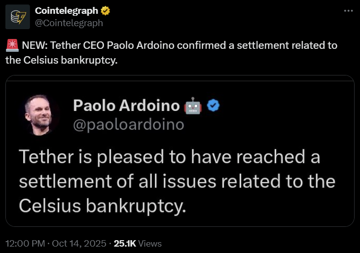 The newly announced $299.5 million settlement represents only a fraction of the roughly $4 billion in claims Celsius had sought in court, following an adversary proceeding filed in August 2024. In July 2025, the bankruptcy court approved the broader lawsuit against Tether to proceed, though it remains unclear how this latest recovery will affect those proceedings.
