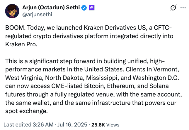 “Under CFTC oversight, Kraken can now integrate clearing, risk, and matching into one environment that meets the same standards as the largest exchanges in the world,” Kraken co-CEO Arjun Sethi said.