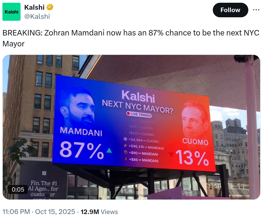 Rychko noted that prediction markets have reached unprecedented levels of mainstream visibility in recent months. Prediction market and Polymarket competitor Kalshi’s New York City screen, which shows a live feed of the market dedicated to the city’s mayoral election, has attracted widespread attention, with the video drawing nearly 13 million views on X alone.