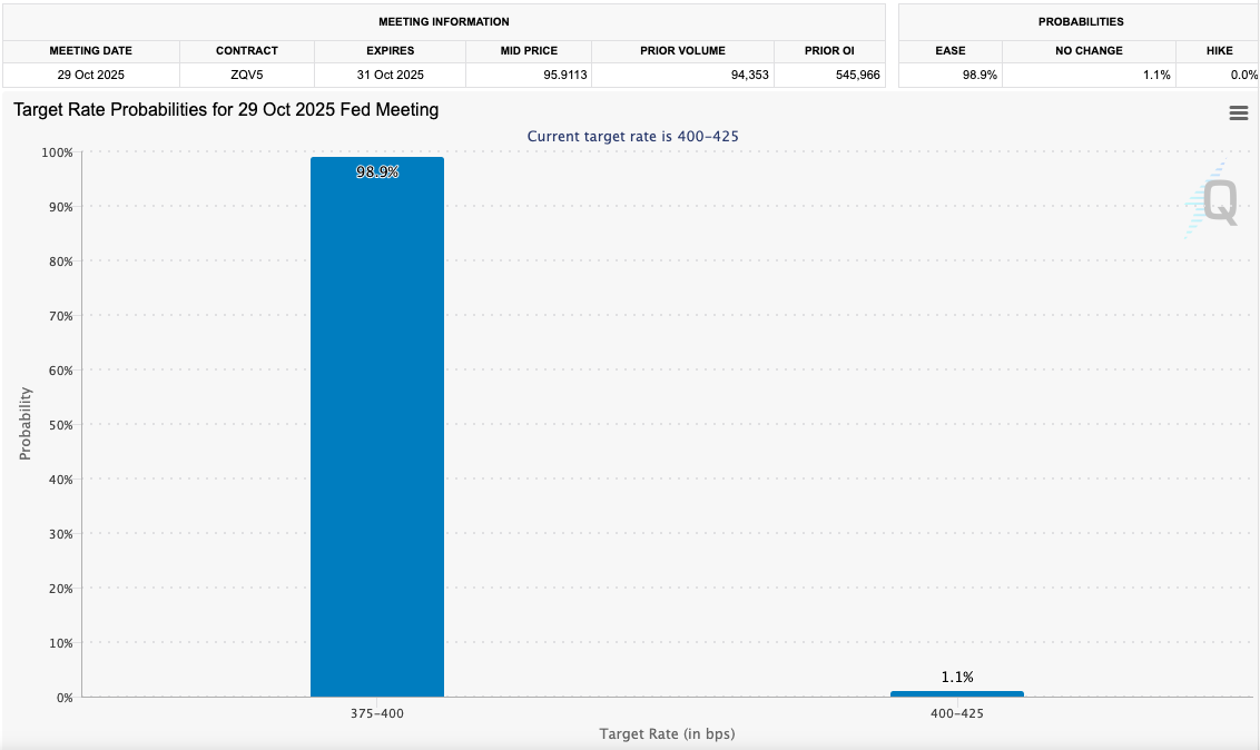 A lower-than-expected CPI print would boost risk assets, as it increases the odds of a rate cut — something that would, in turn, boost liquidity inflows later. The latest data from CME Group’s FedWatch Tool shows that markets already expect a 0.25% cut on Oct. 29.