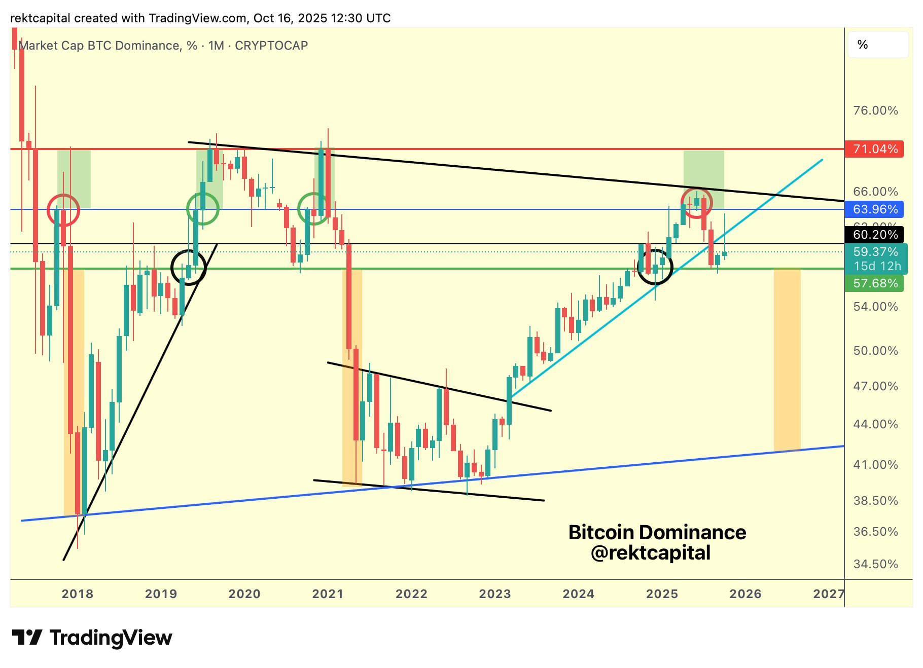 Dominance measured 59.6% at the time of writing, having spiked to 63.5% on Oct. 10. As Cointelegraph reported, market analyst Rekt Capital sees the area around 70% as classic trend reversal territory.