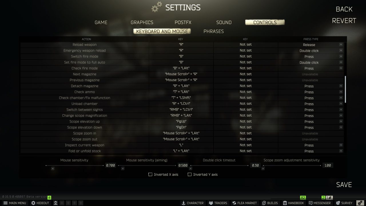 The PC control scheme reflects the complexity of mil-sim, with the settings spanning about four full pages. There are dozens of discrete actions, each bindable to multiple keys or buttons and configurable with modifiers (hold, on release, double-tap, and other per-action options).
