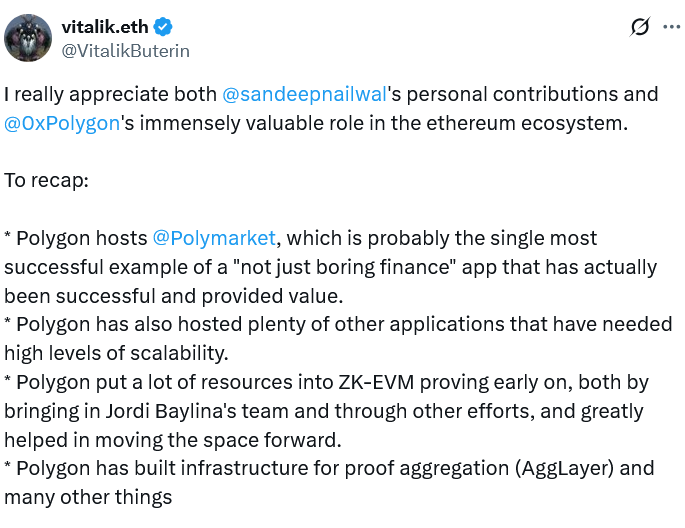 His post later prompted a response from Ethereum co-founder Vitalik Buterin, who made a point to acknowledge Polygon’s achievements in the broader Ethereum community.