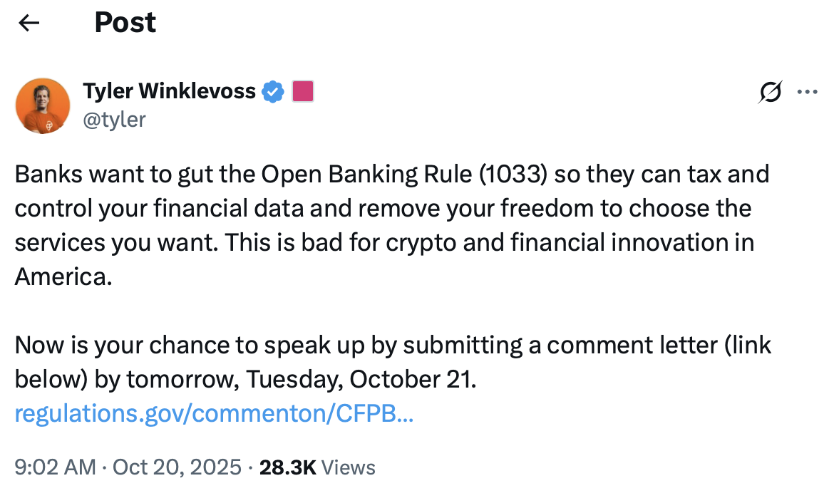 On Monday, Gemini co-founder Tyler Winklevoss wrote on X: “Banks want to gut the Open Banking Rule (1033) so they can tax and control your financial data and remove your freedom to choose the services you want. This is bad for crypto and financial innovation in America.”