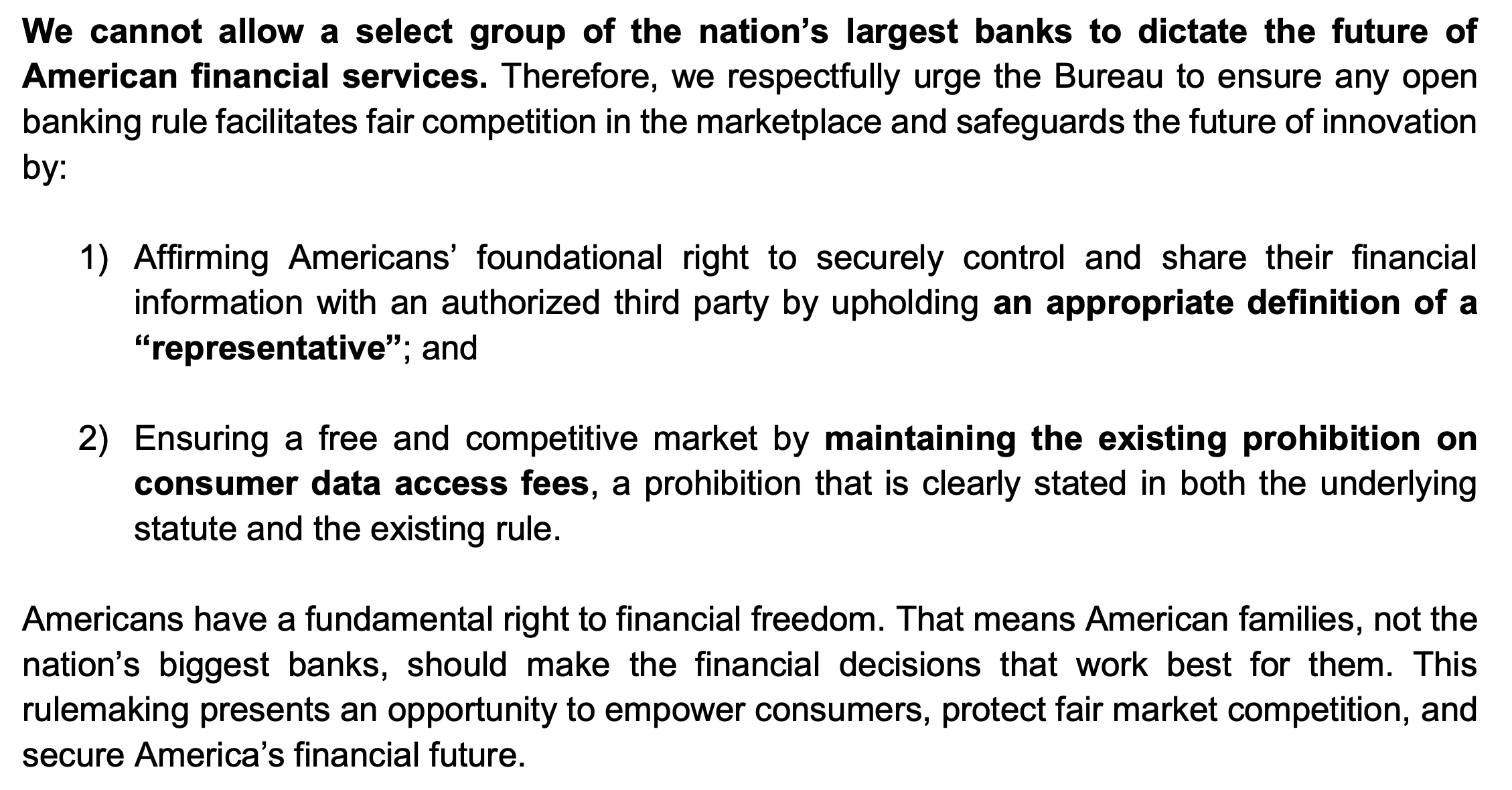 The group also pressed the CFPB to preserve the current ban on data access fees, saying the rule must uphold a free and competitive market and that the prohibition is already clearly established in law.