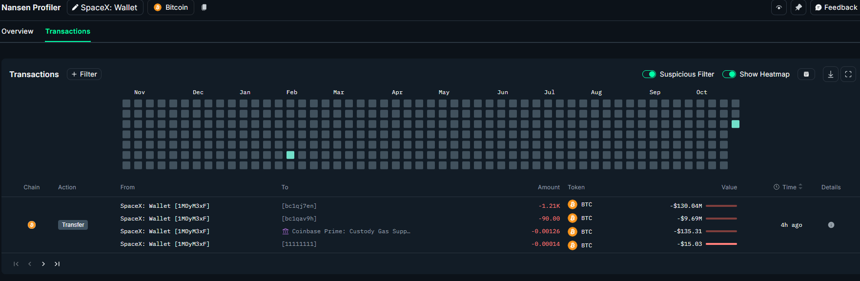 The SpaceX-labelled wallet “1MDyM” transferred $130 million worth of Bitcoin to address “bc1qj,” while another SpaceX wallet “1AXeF” sent $127 million in Bitcoin to address “bc1qq,” according to data from blockchain intelligence platform Nansen.