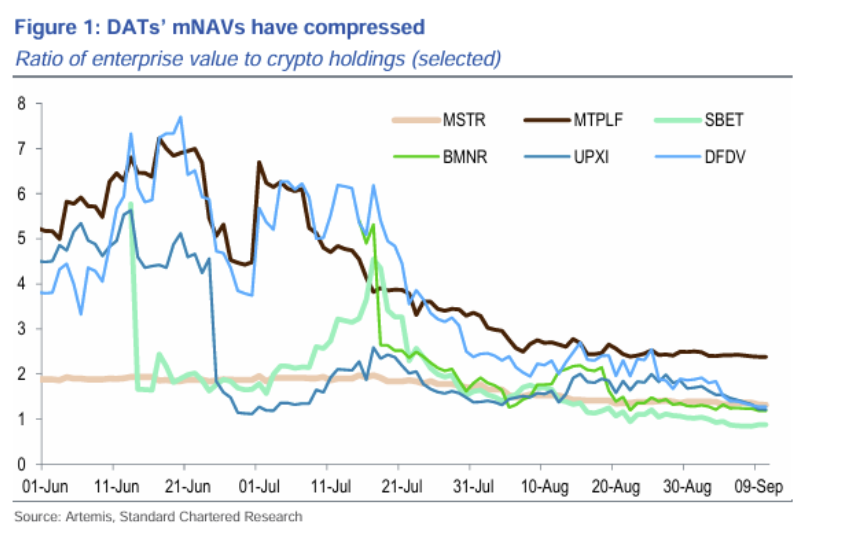 Analysts at Standard Chartered have cautioned that digital asset treasury companies could face a valuation squeeze as market net asset values (mNAVs), which compare a company’s enterprise value to its crypto holdings, continue to decline.