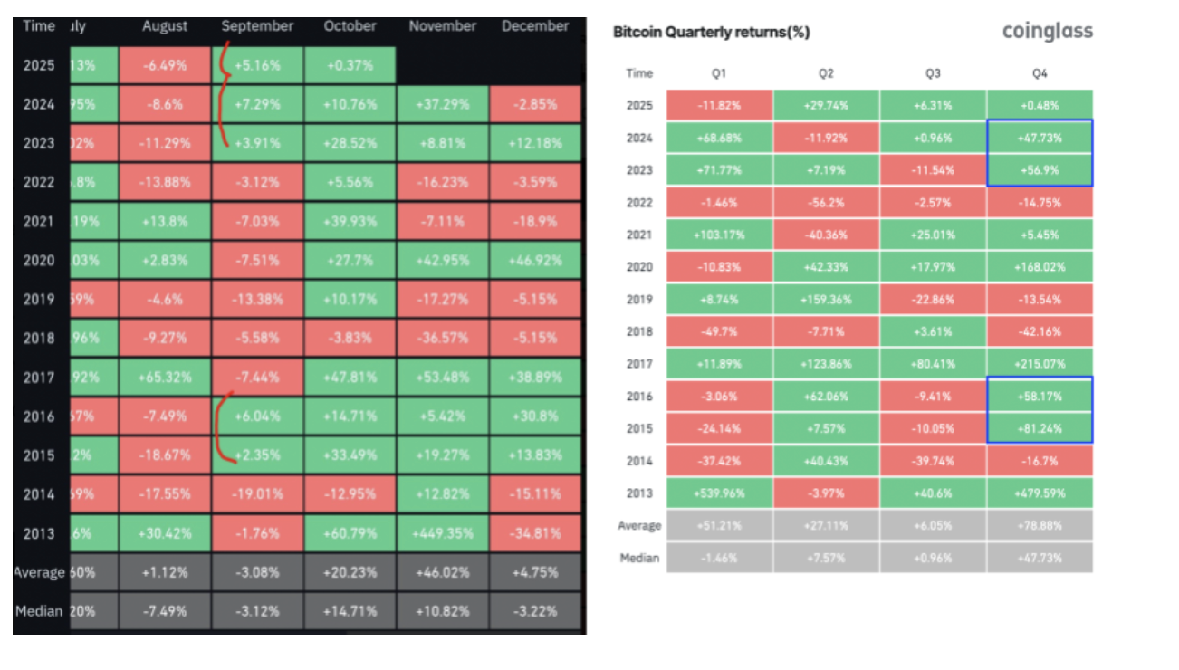 Moreover, the period between October and December is the best quarter for Bitcoin price rallies with average gains of 78%.