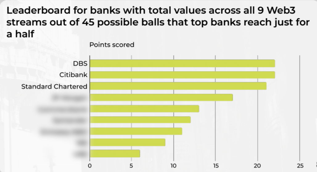 The report maps regional success patterns, sequencing and rollout playbooks. A leaderboard shows top performers such as DBS and Citi already past the halfway mark on a 45-point maturity scale, with Standard Chartered and others close behind.