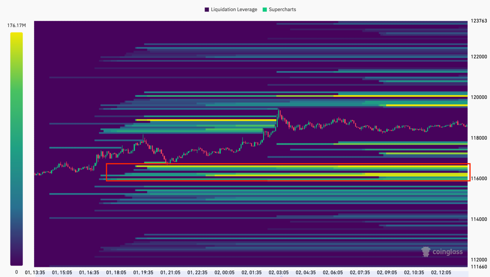 The BTC liquidity map shows bid clusters stacked between $116,000 and $117,800.