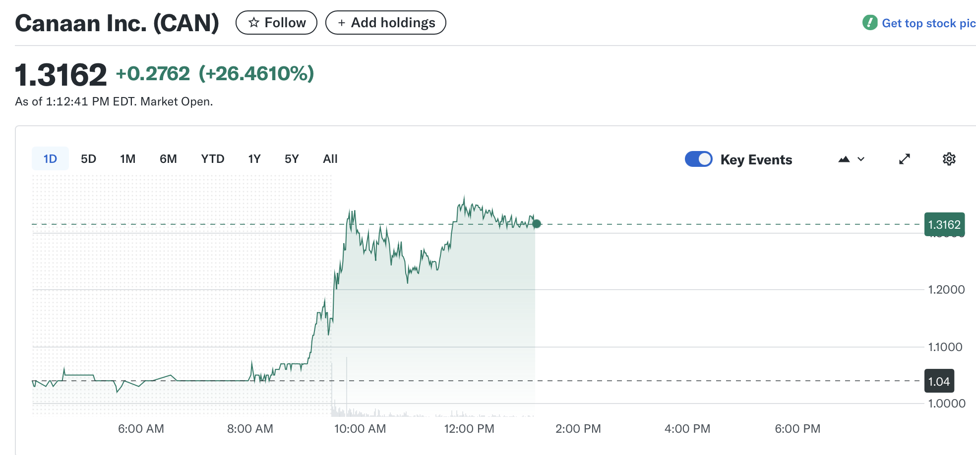Canaan, a crypto mining hardware company founded in Beijing in 2013, saw its shares up 26.4% at $1.31 on Nasdaq at the time of writing, according to Yahoo Finance