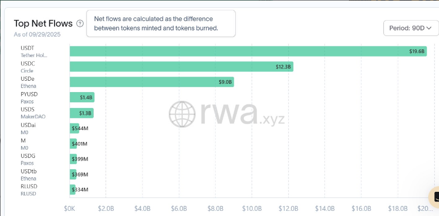Despite rising competition, Tether’s USDt (USDT) and Circle’s USDC (USDC) continue to lead the market. USDt recorded $19.6 billion in net inflows during the third quarter, followed by USDC with $12.3 billion and Ethena’s USDe with $9 billion, according to industry data.