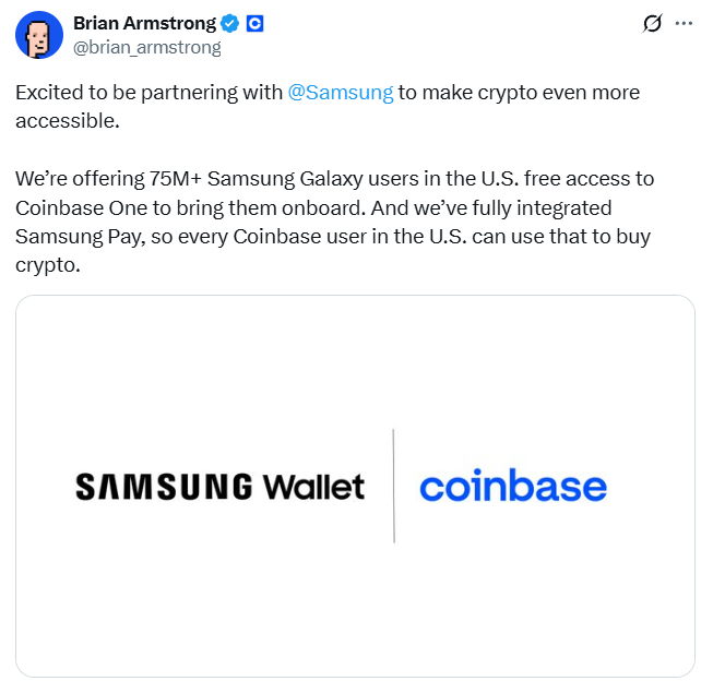 Samsung Wallet partnership will make crypto “more accessible,” says Coinbase CEO