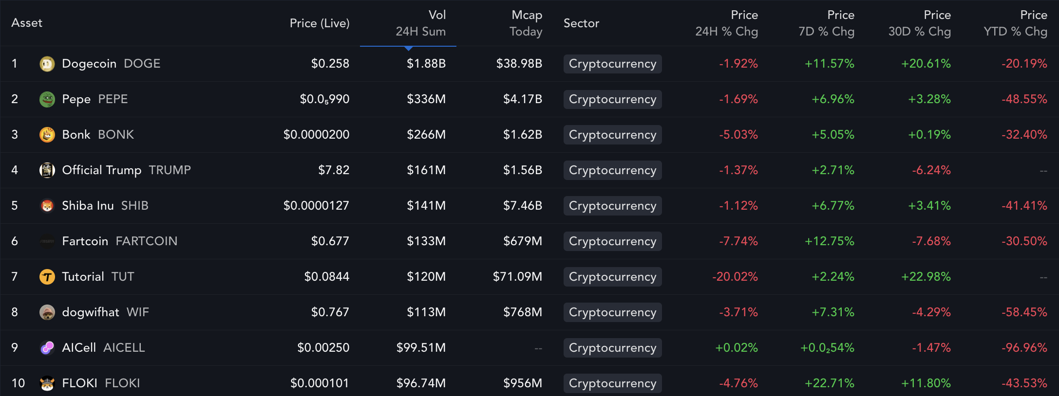 Top 10 memecoins (by volume) and their daily, weekly, monthly and year-to-date performances. Source: Messari