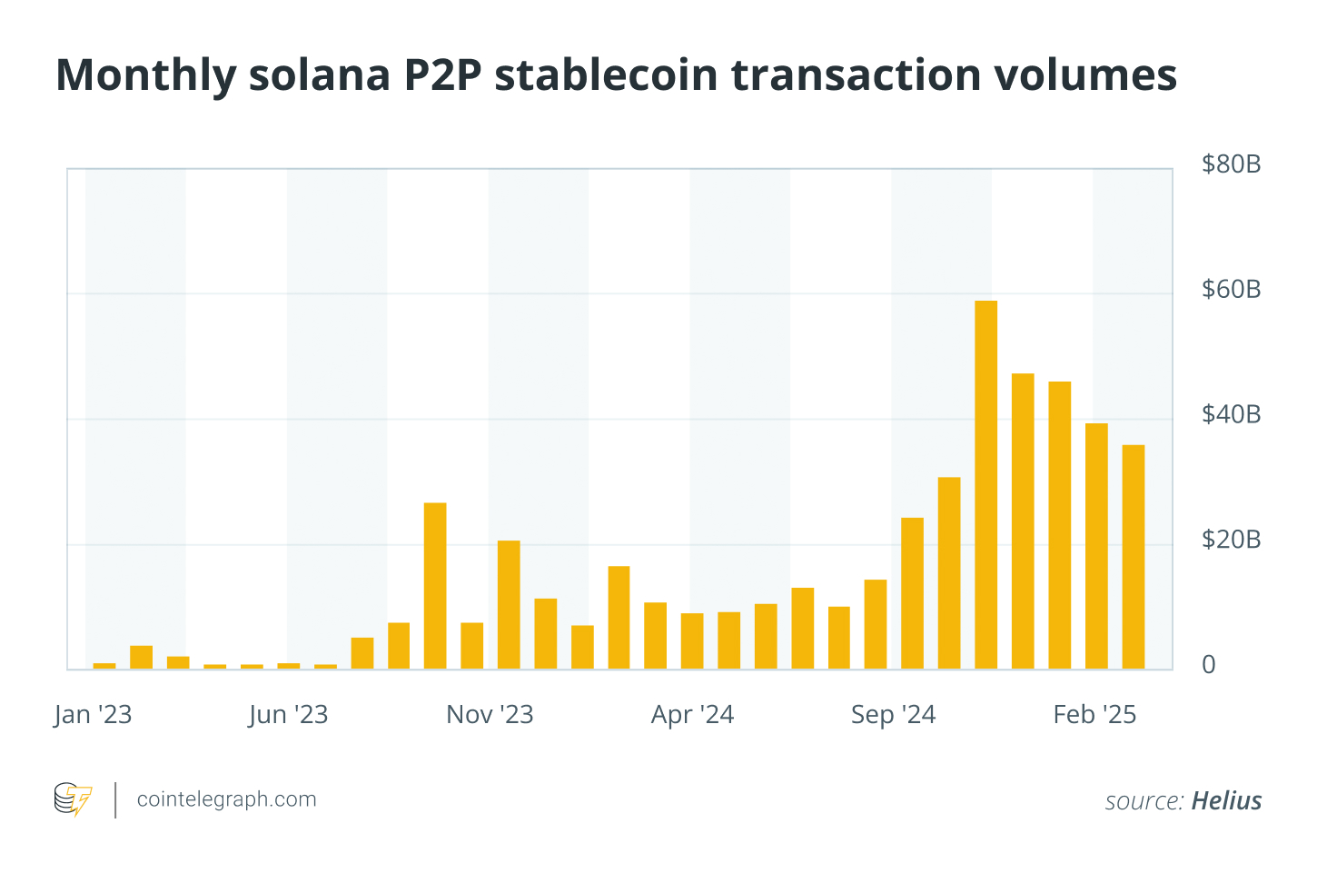 In January 2025, Solana processed $59.2 billion in peer-to-peer (P2P) stablecoin transfers, a sharp rebound from the lows of late 2024. The supply of USDC on Solana stands at approximately $9.35 billion, while the network’s total stablecoin supply more than doubled in early 2025, climbing from $5.2 billion in January to $11.7 billion in February.