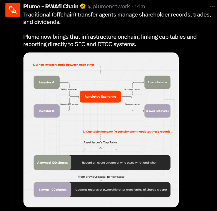 Plume said its registration allows it to replicate and automate those roles onchain, “linking cap tables and reporting directly to SEC and DTCC systems,” a reference to the Depository Trust and Clearing Corporation, which is responsible for settling securities transactions.