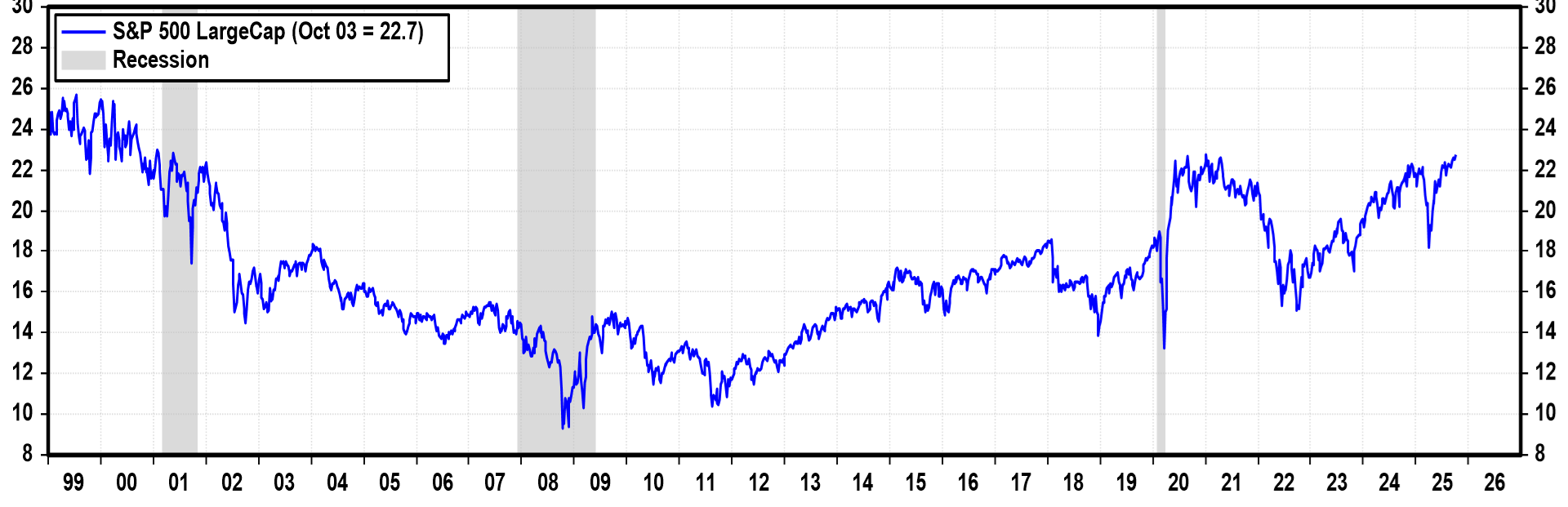 According to Yardeni Research data, the S&P 500 forward price-to-earnings multiple sits near 23 times, well below the 25 times peak seen in 2000, implying there is still room for multiple expansion under favorable sentiment.
