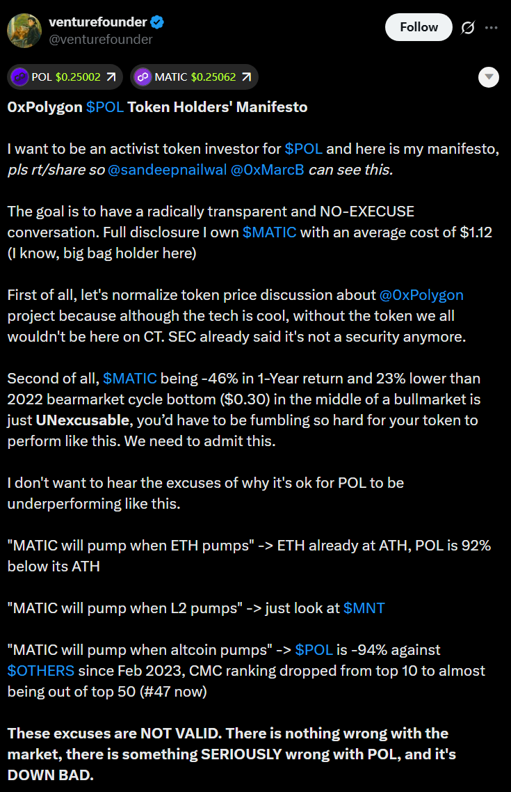 The proposal follows a widely circulated manifesto posted by Venturefounder on X, which has garnered over 25,000 views. In that post, the investor described POL’s 46% decline over the past year, and its current trading level below 2022 bear-market lows, as “inexcusable” during what many consider a crypto bull market led by Bitcoin (BTC) and Ether.