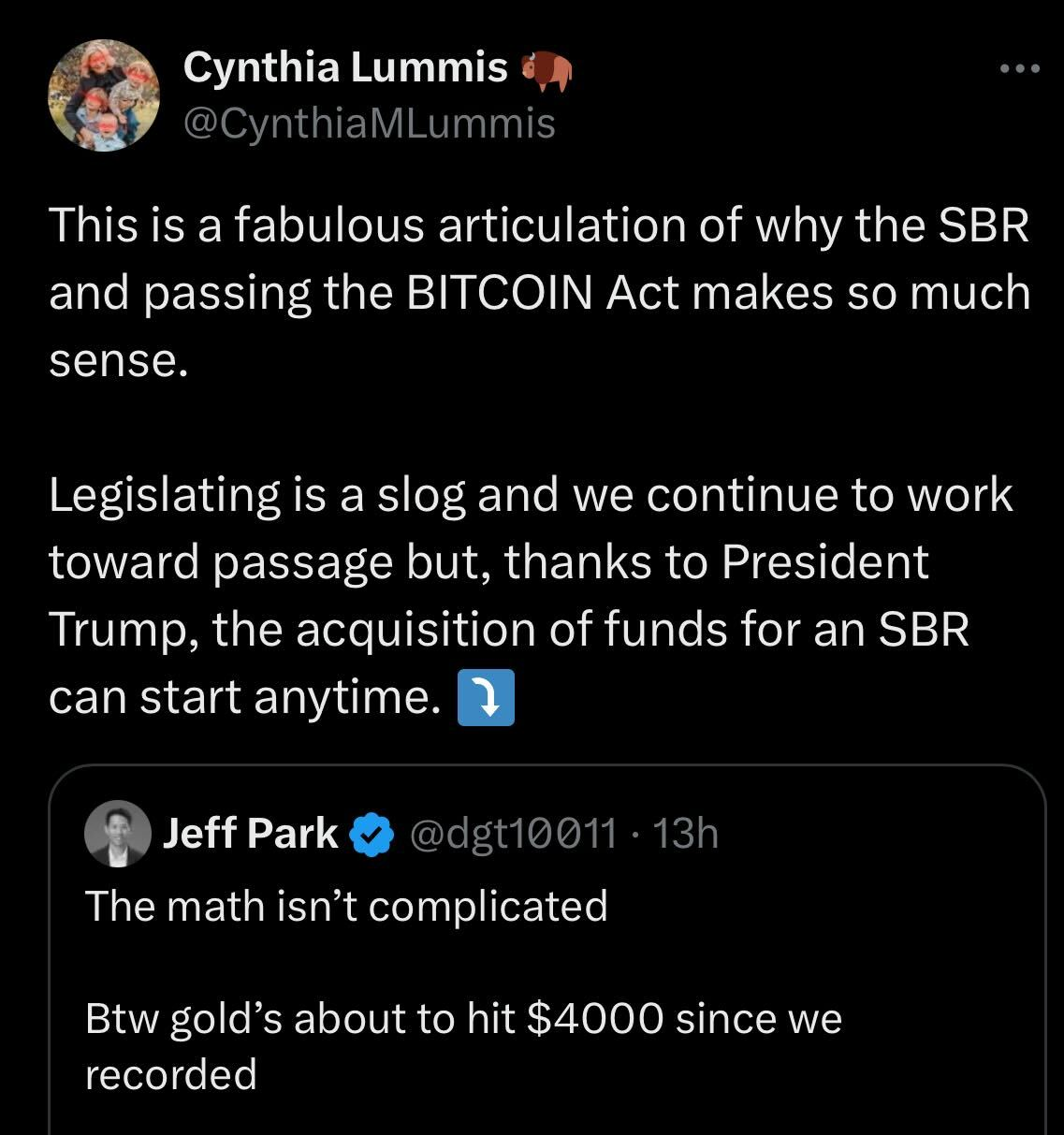 Lummis made the comments in response to a post from ProCap BTC chief investment officer Jeff Park, who shared a video of himself and Bitcoin bull Anthony Pompliano discussing the potential of the SBR.