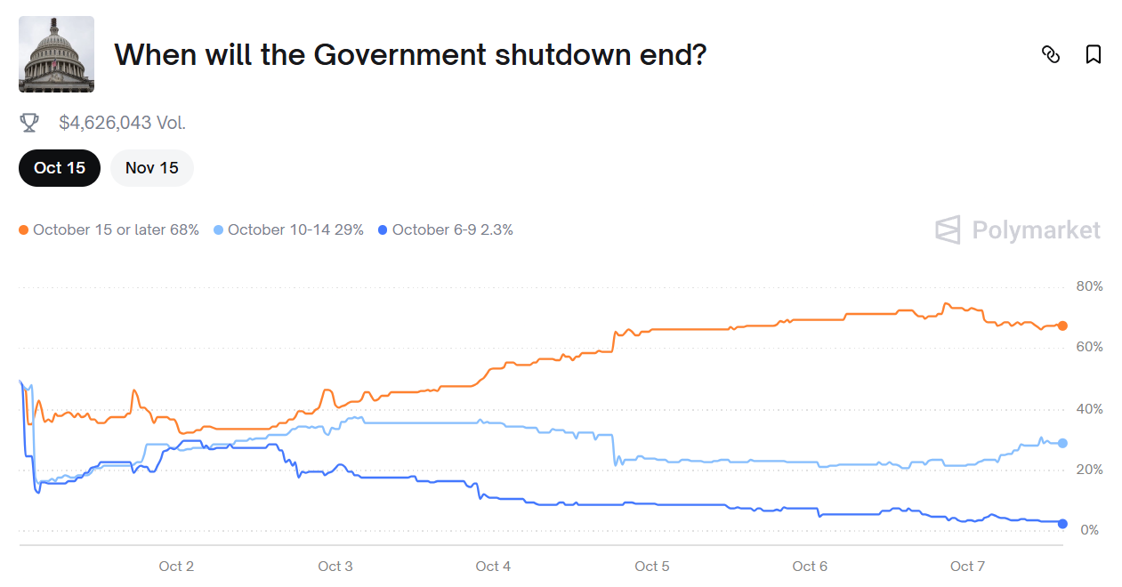Odds of the government shutdown ending by Oct. 15. Source: Polymarket